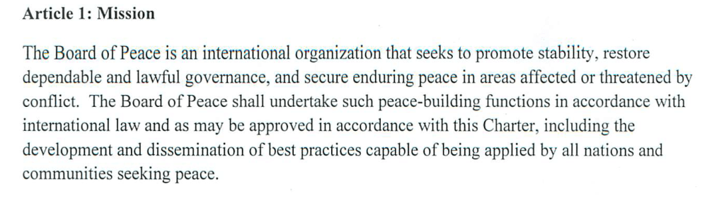 Se trata de una entidad creada por la vanidad y para los intereses de un hombre. Todo depende de la voluntad del Chairman, de Trump y el objetivo es la resolución de los conflictos globales. [Ni una sola mención a Gaza cuya “reconstrucción” se suponía el propósito de la Junta de Paz]